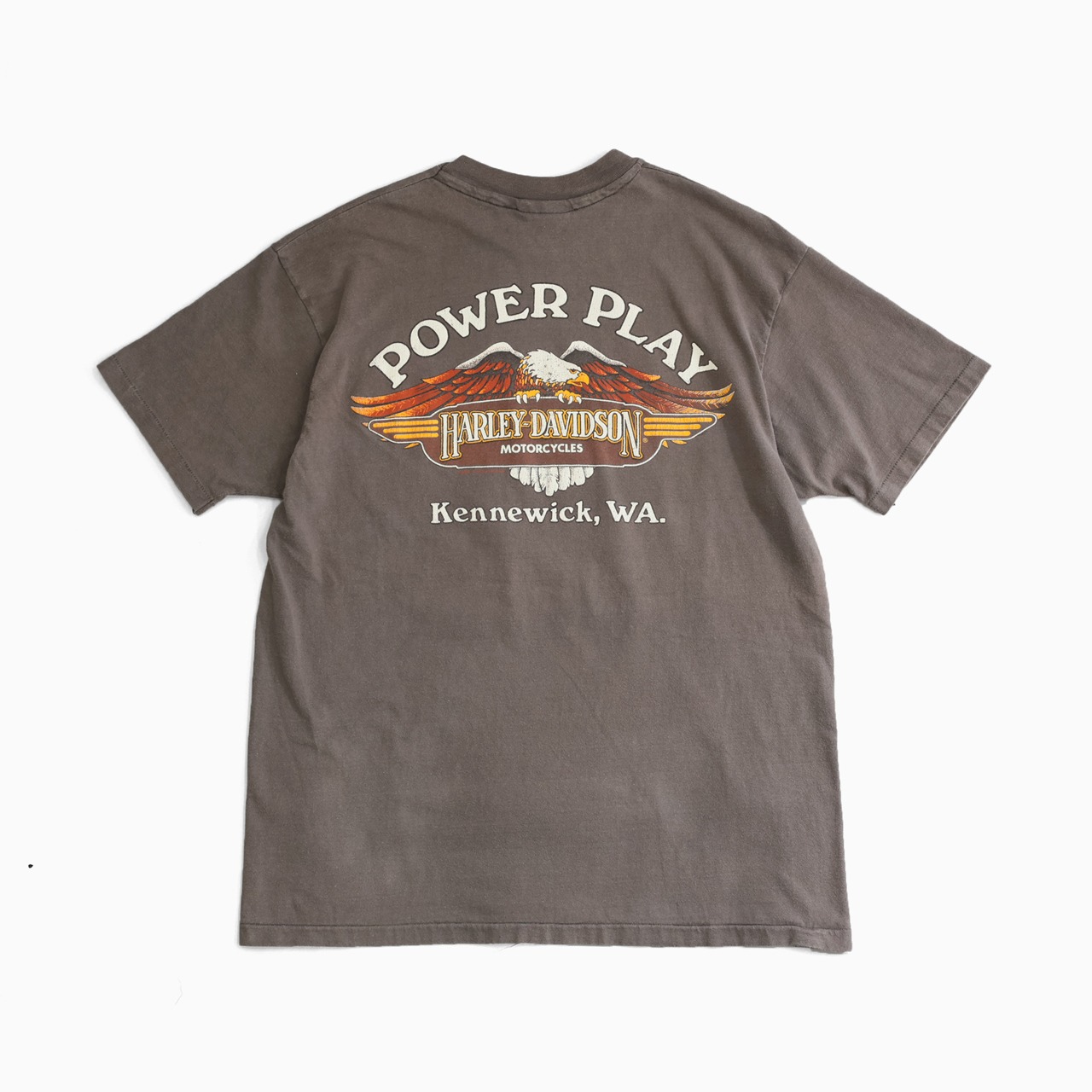 墨黒の様な茶系グレーカラーが特徴のハーレーTシャツ。