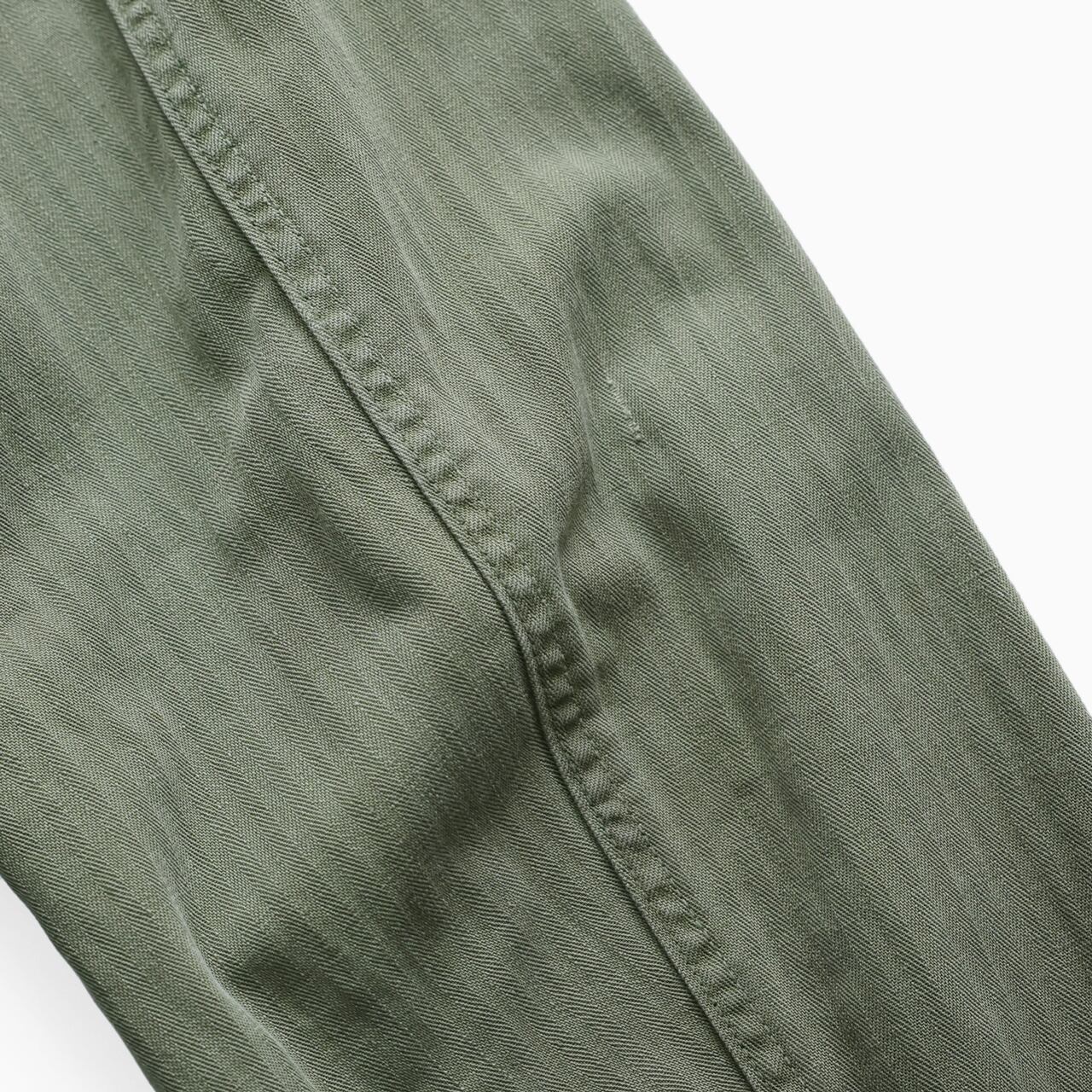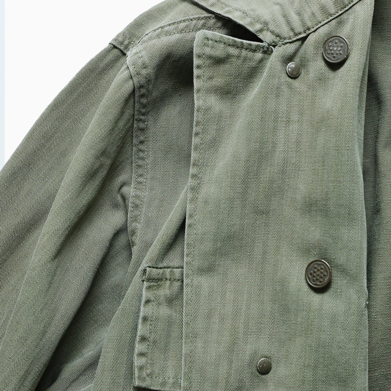 M43フィールドジャケットの後継型で、1947年にアメリカ軍に採用されたM1947フィールドジャケット。オリーブカラーのタフなヘリンボーンツイル。両胸に大型ポケットを配置し、袖は筒袖。13スターのメタルボタンを採用。