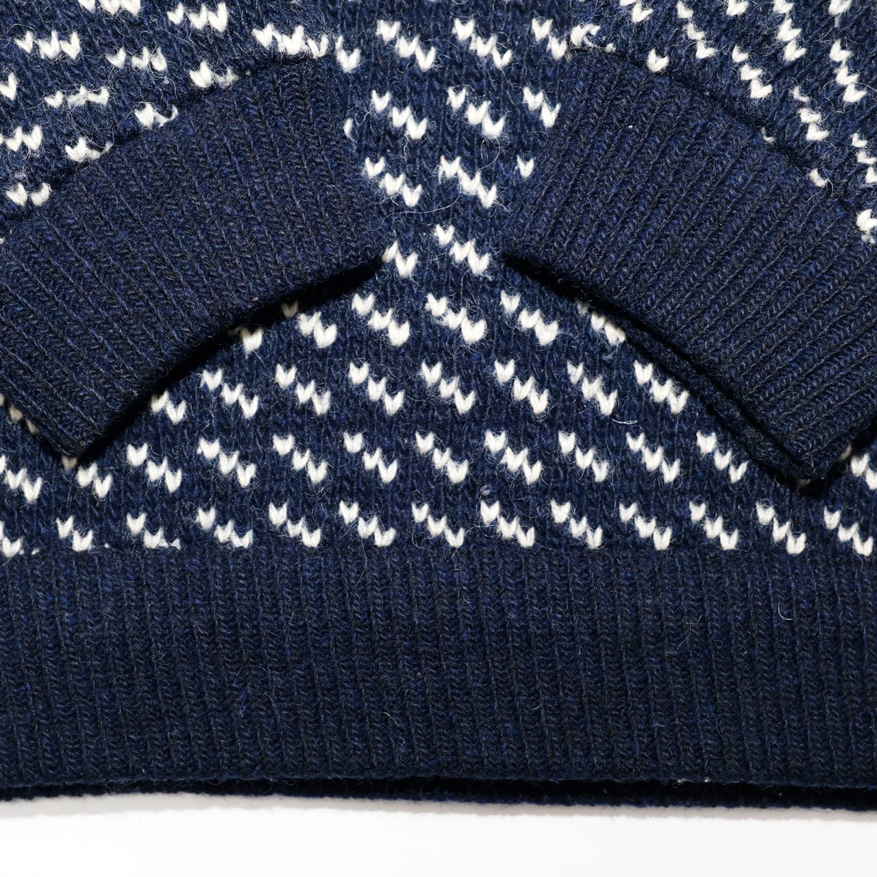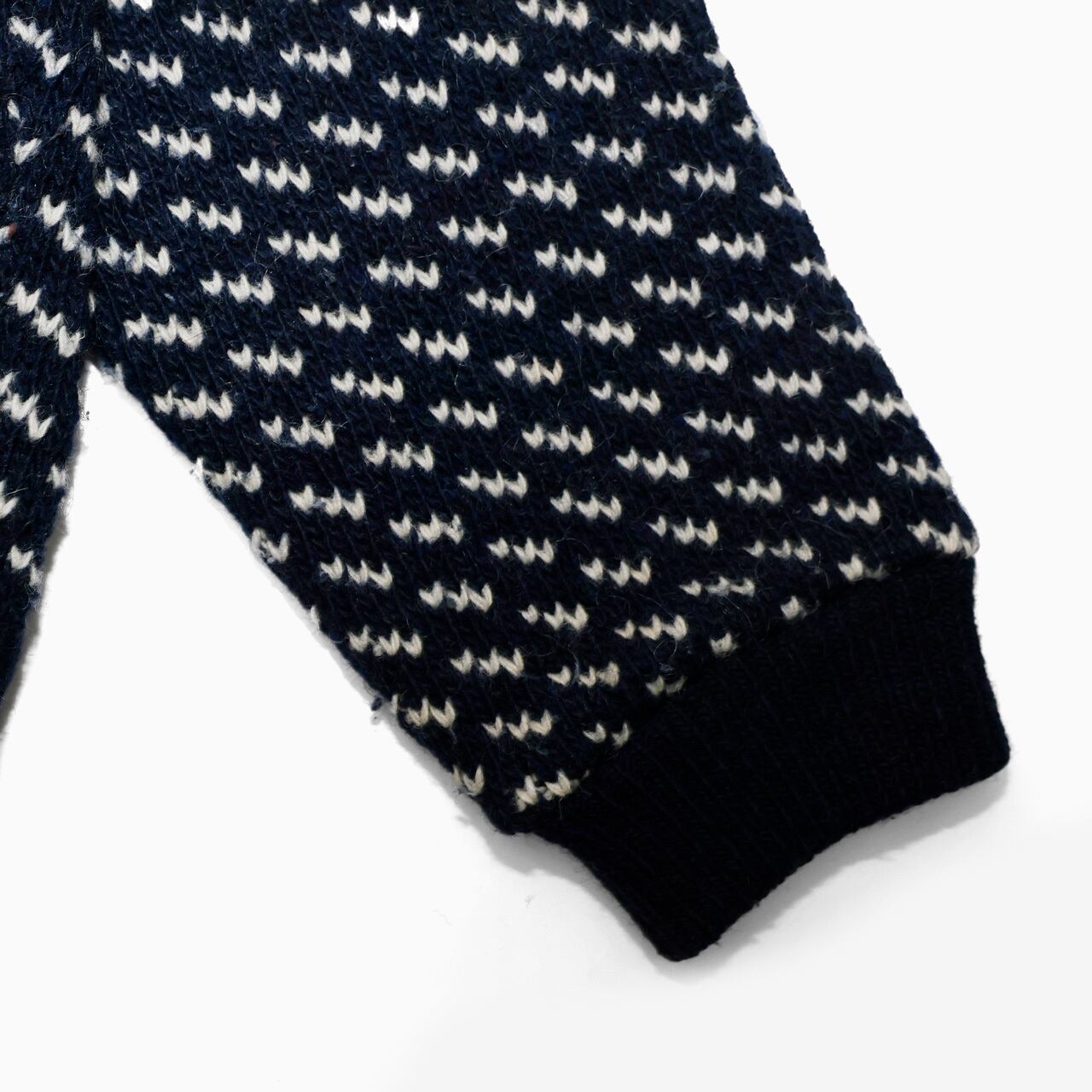ネイビーベースに白のバーズアイ柄が入る大変人気の高い一着。ウール80%・レーヨン20%の混紡素材が特徴のノルウェー製。言わずと知れた逸品です。多少の毛羽立ちがありますが、シミ等はない一枚です。