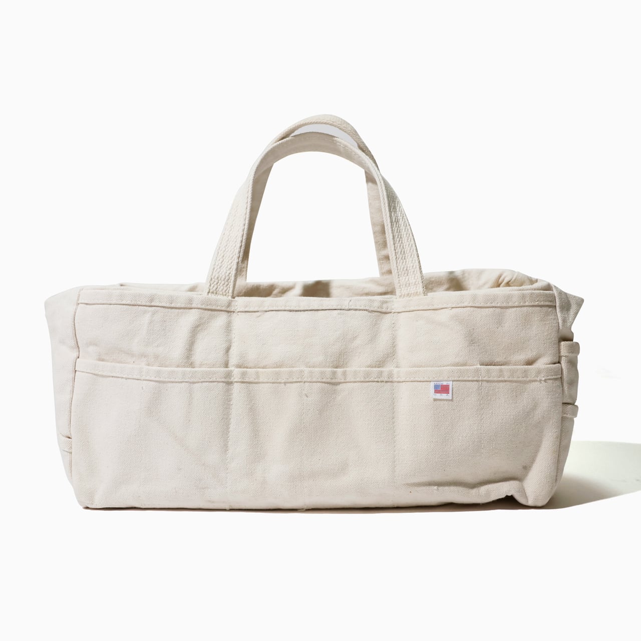 耐久性のある厚手のキャンバス生地で作られたツールバッグ。多くの外ポケットを備えており、収納力と機能性に優れています。前面のポケット部分に、小さな米国旗のタグが付いているのが嬉しいポイント。荷物の取り出しが容易なものプラス!