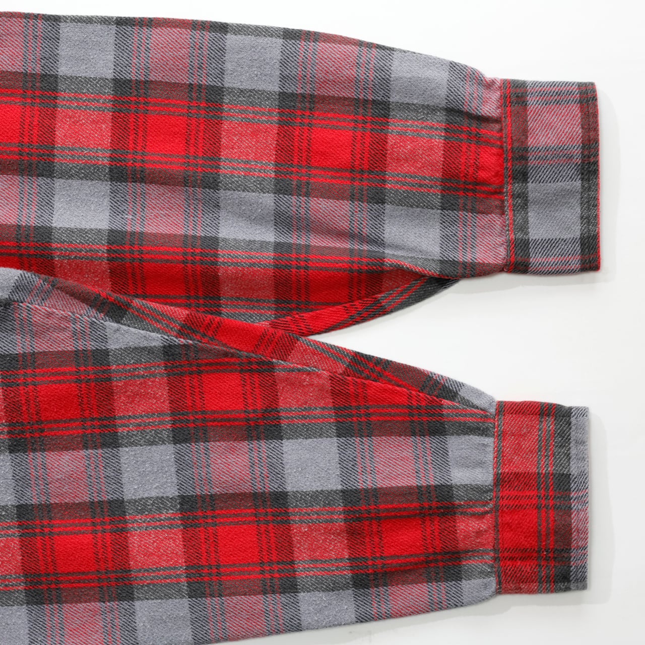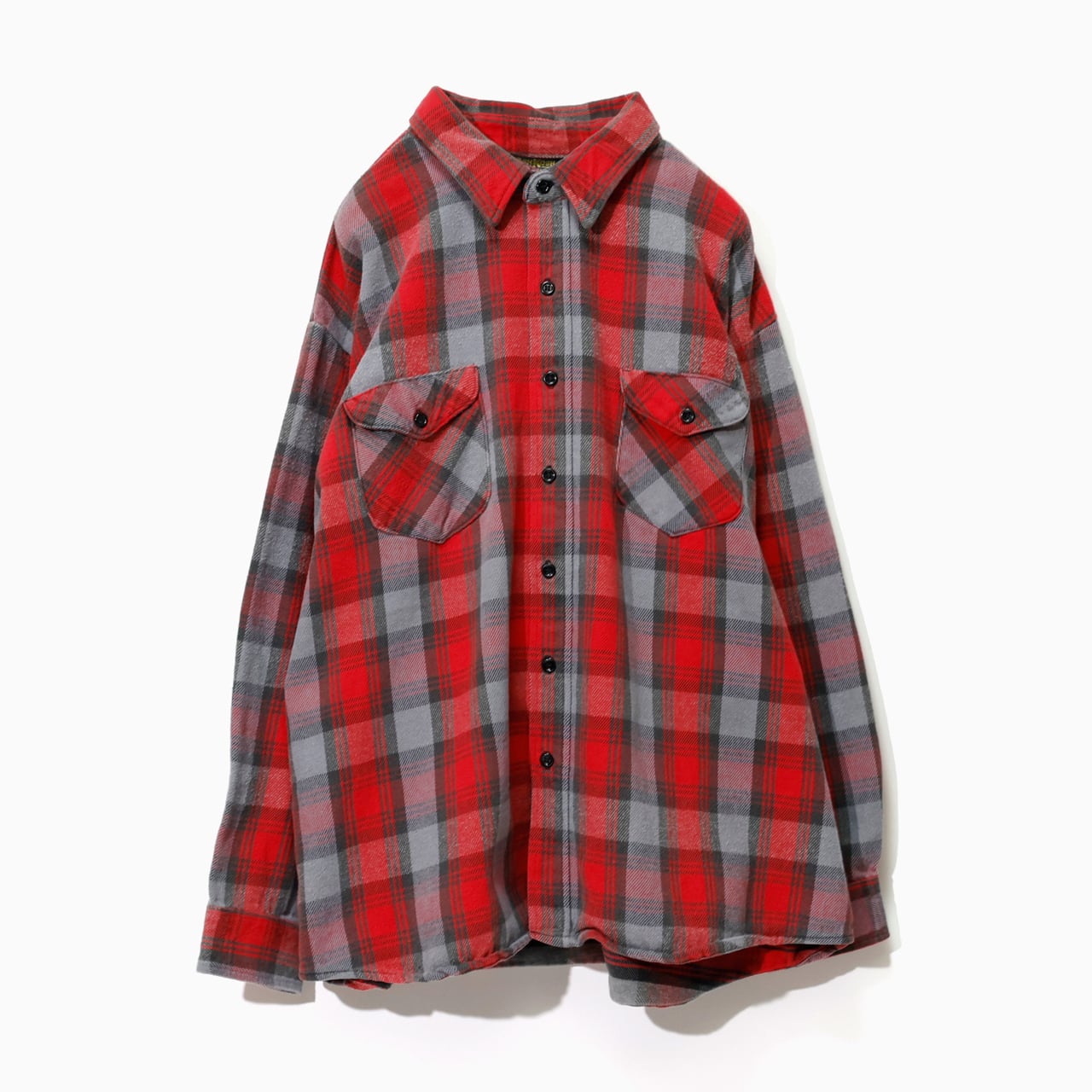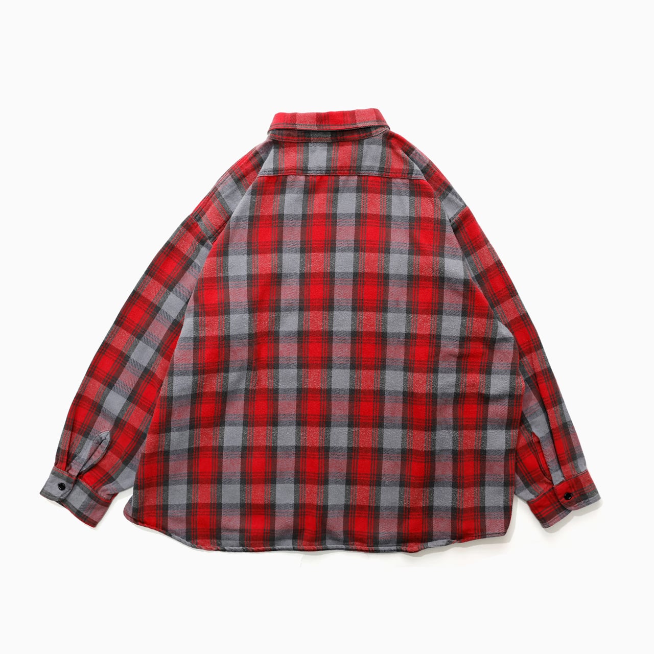 1980年代 OSHKOSHのボックスシルエットネルシャツ。青みがかったグレーと、くすんだ赤の配色がおしゃれな1枚。大きめのサイズ感なので、インナーにフーディなどレイヤードして楽しめそうです。