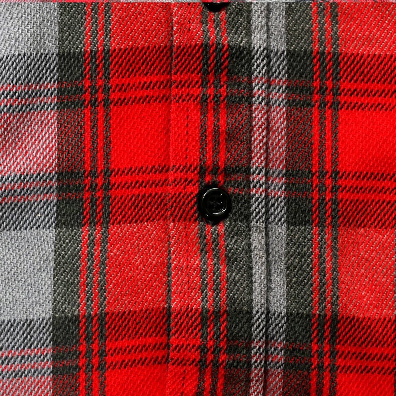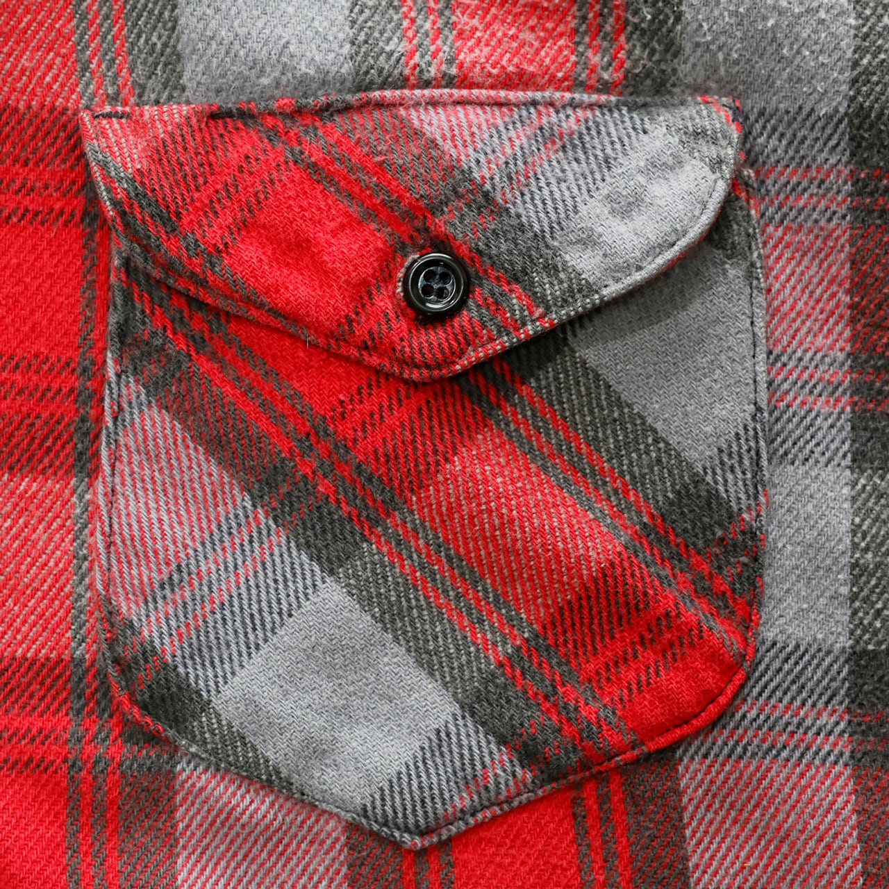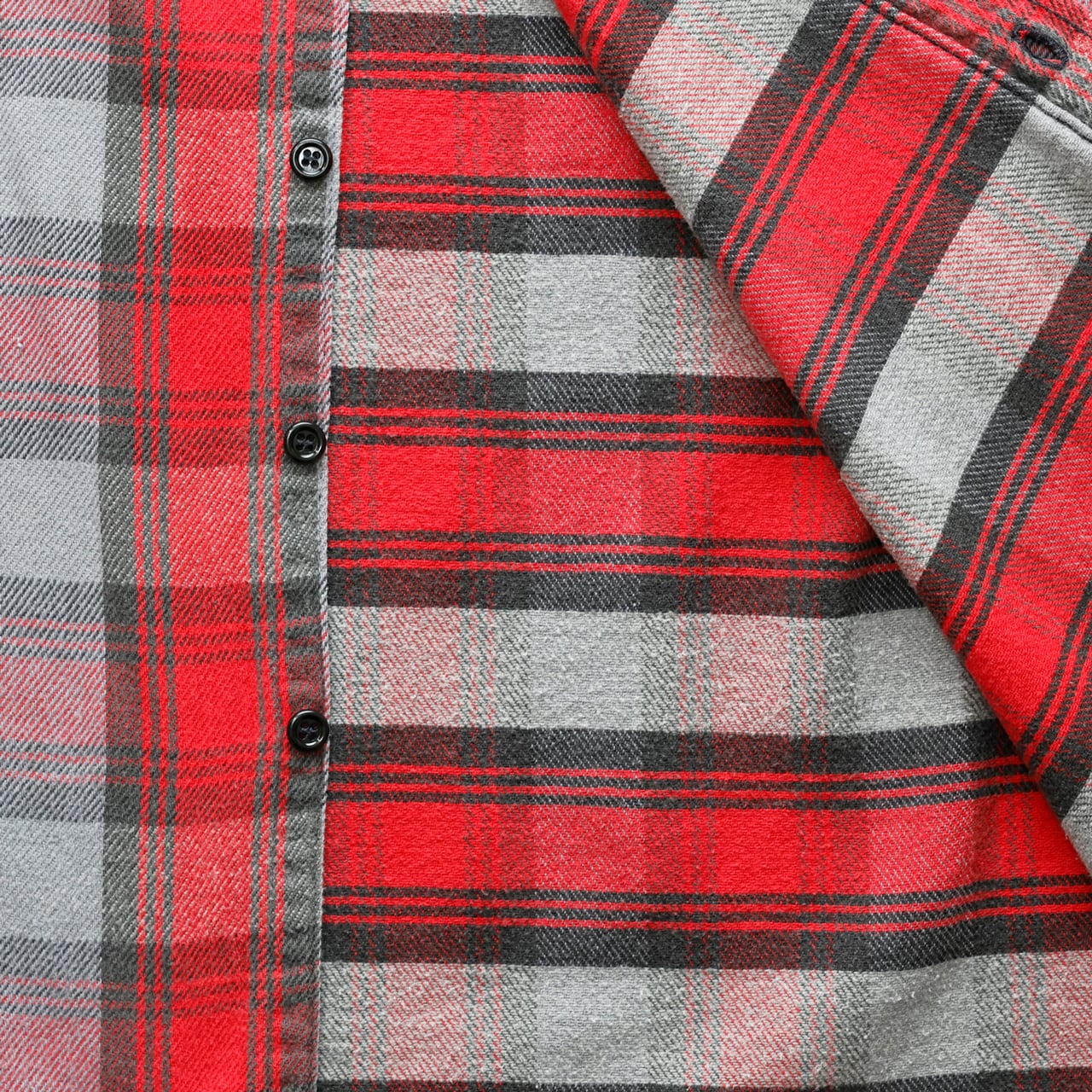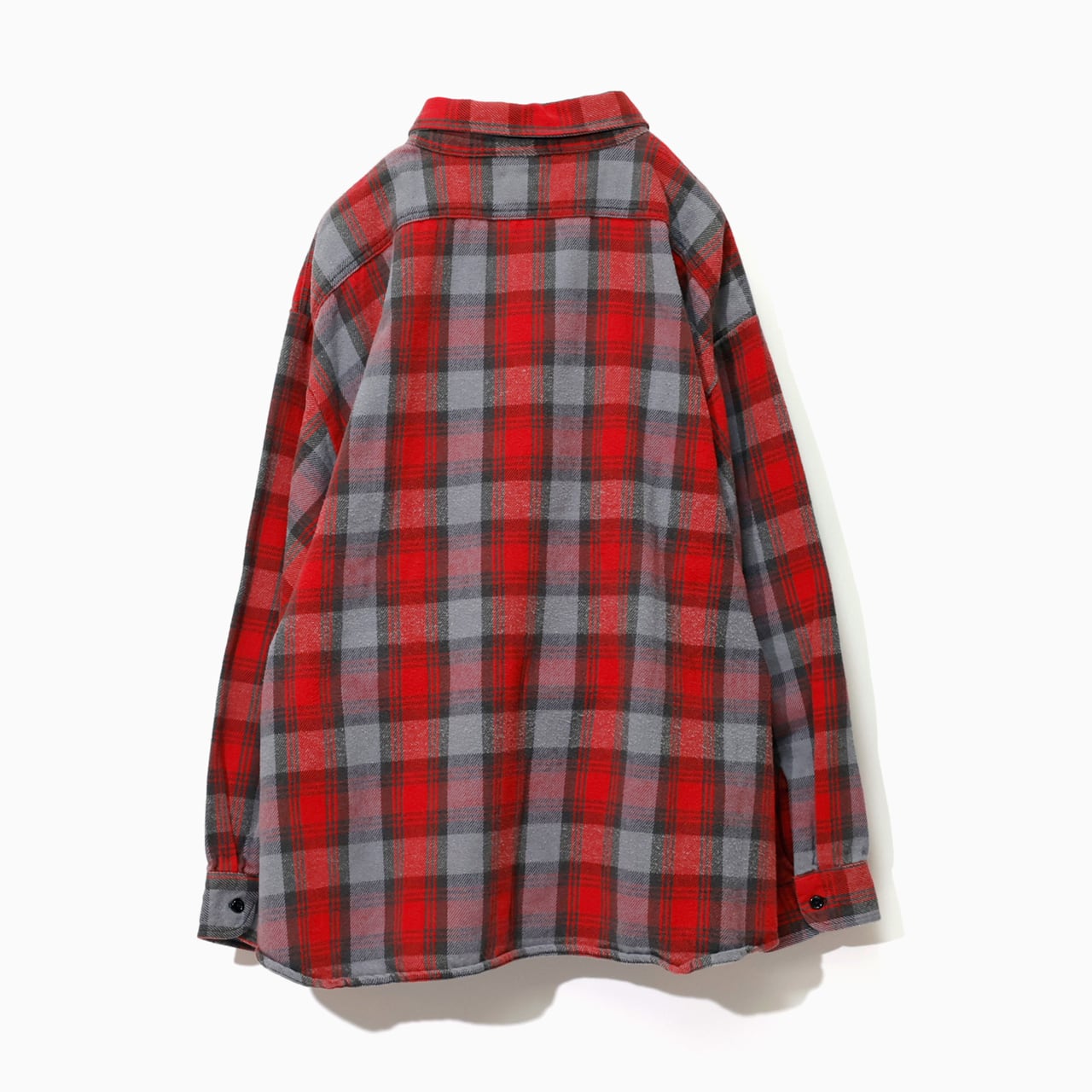 1980年代 OSHKOSHのボックスシルエットネルシャツ。青みがかったグレーと、くすんだ赤の配色がおしゃれな1枚。大きめのサイズ感なので、インナーにフーディなどレイヤードして楽しめそうです。