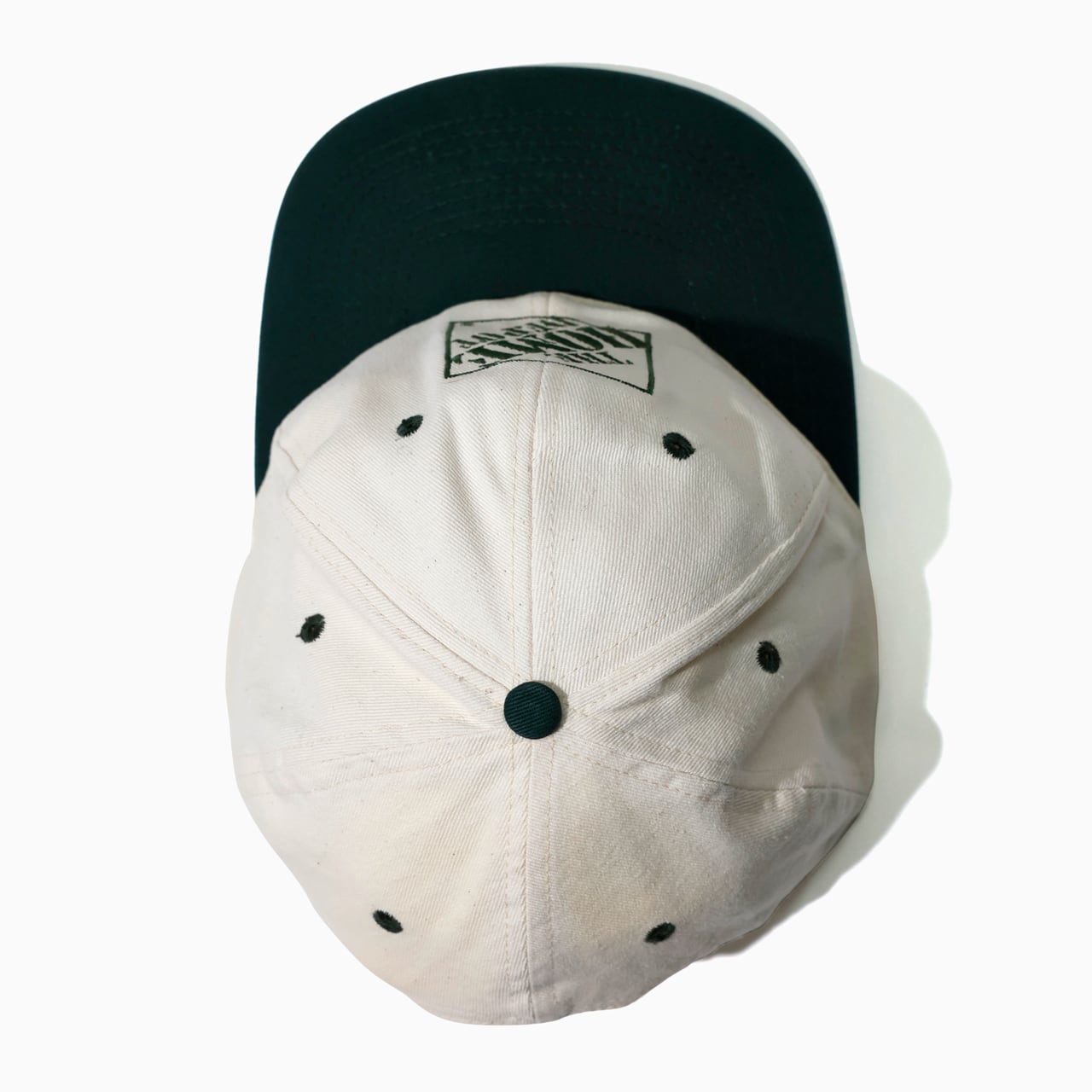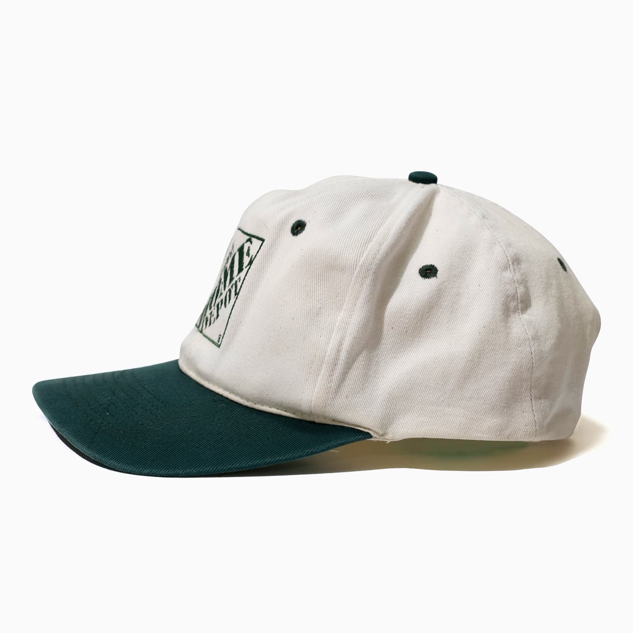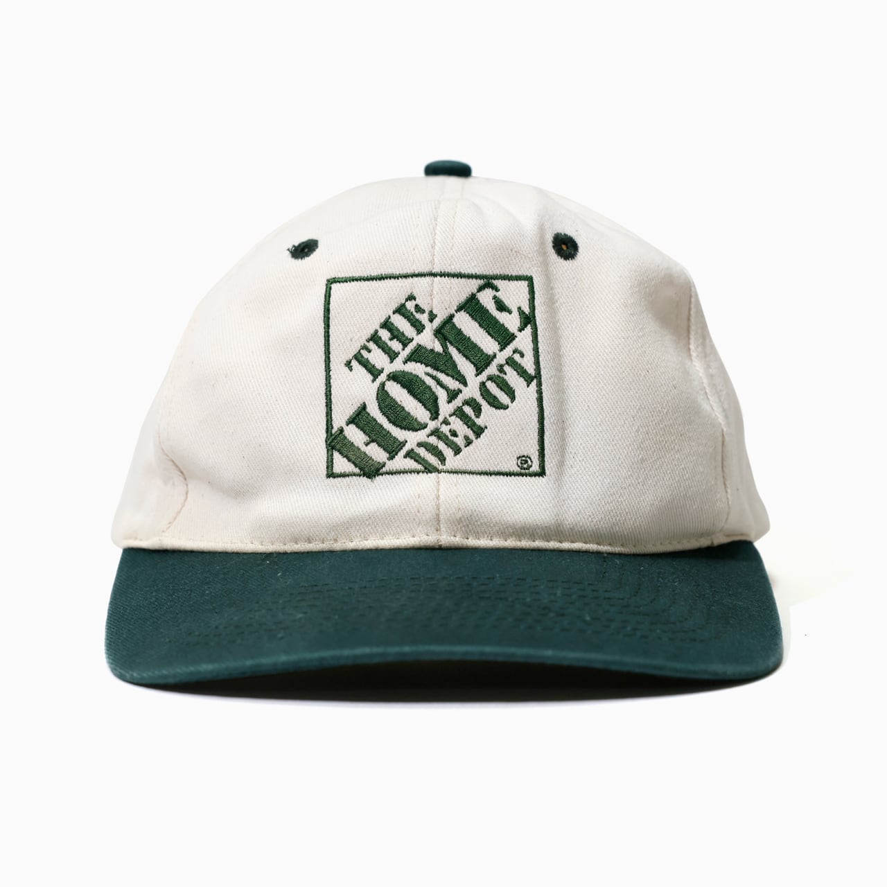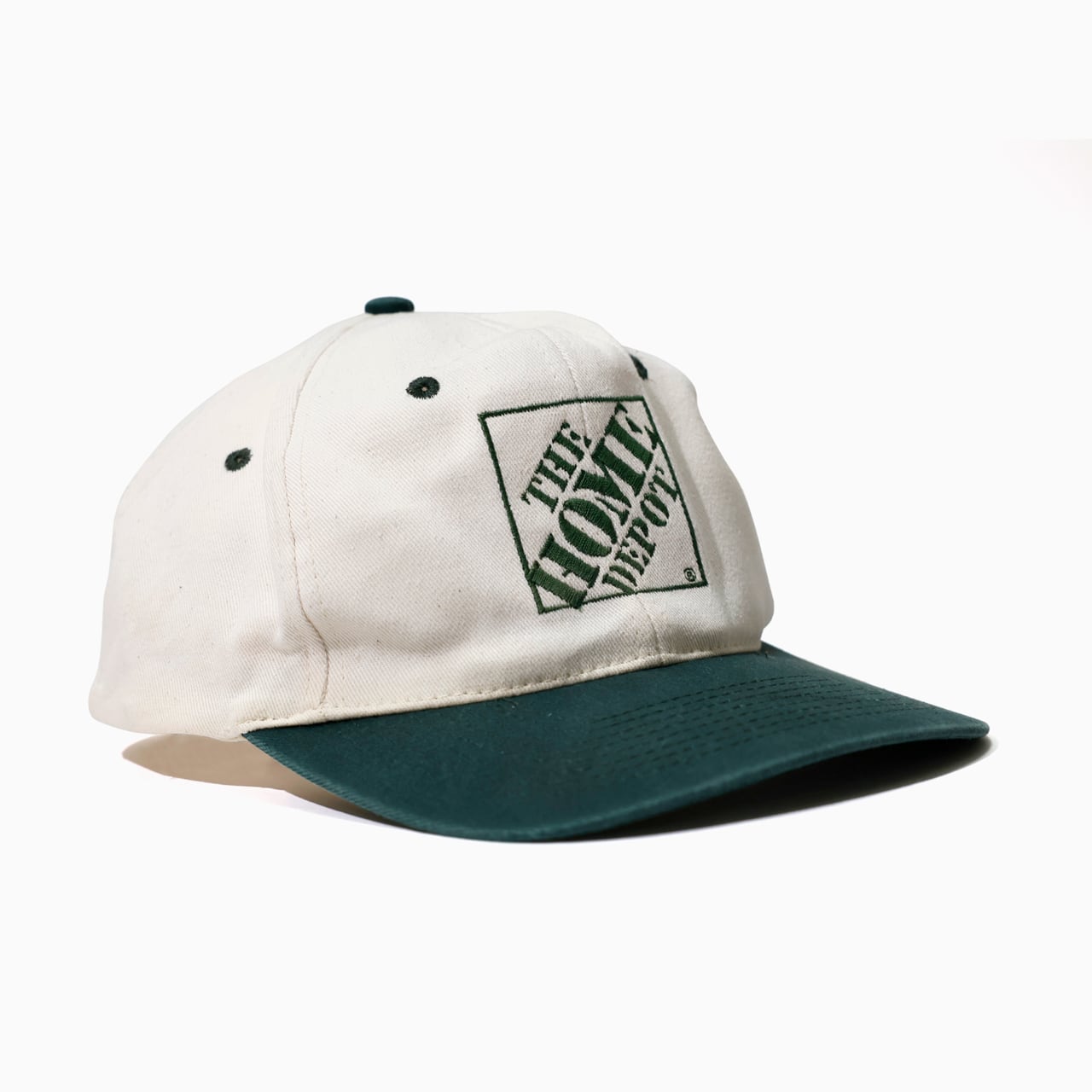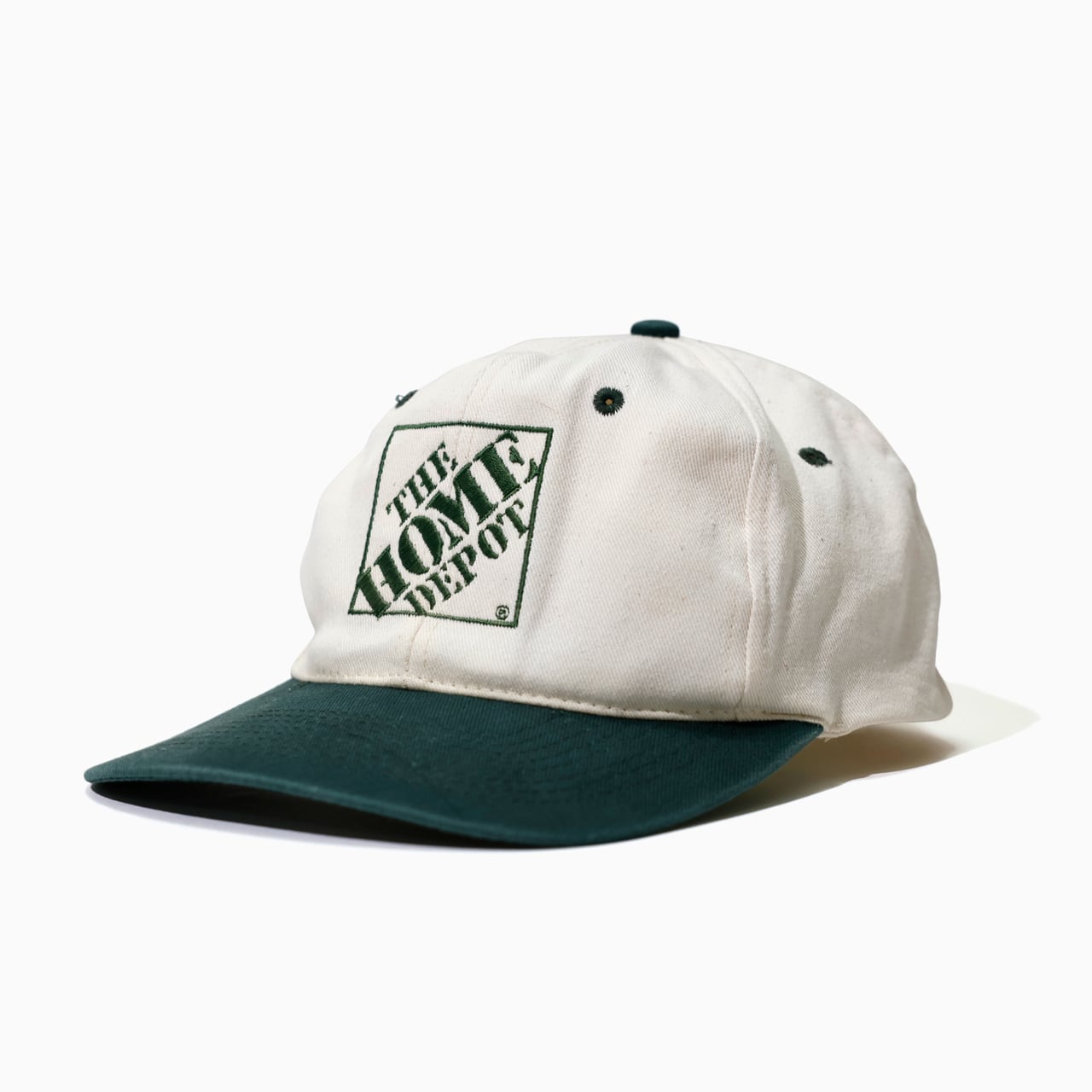 アメリカのホームセンター「THE HOME DEPOT」のキャップ。フロントに「THE HOME DEPOT」のボックスロゴが刺繍されています。よくあるショップカラーのオレンジではない生成り×グリーンの使いやすいカラーリングです。