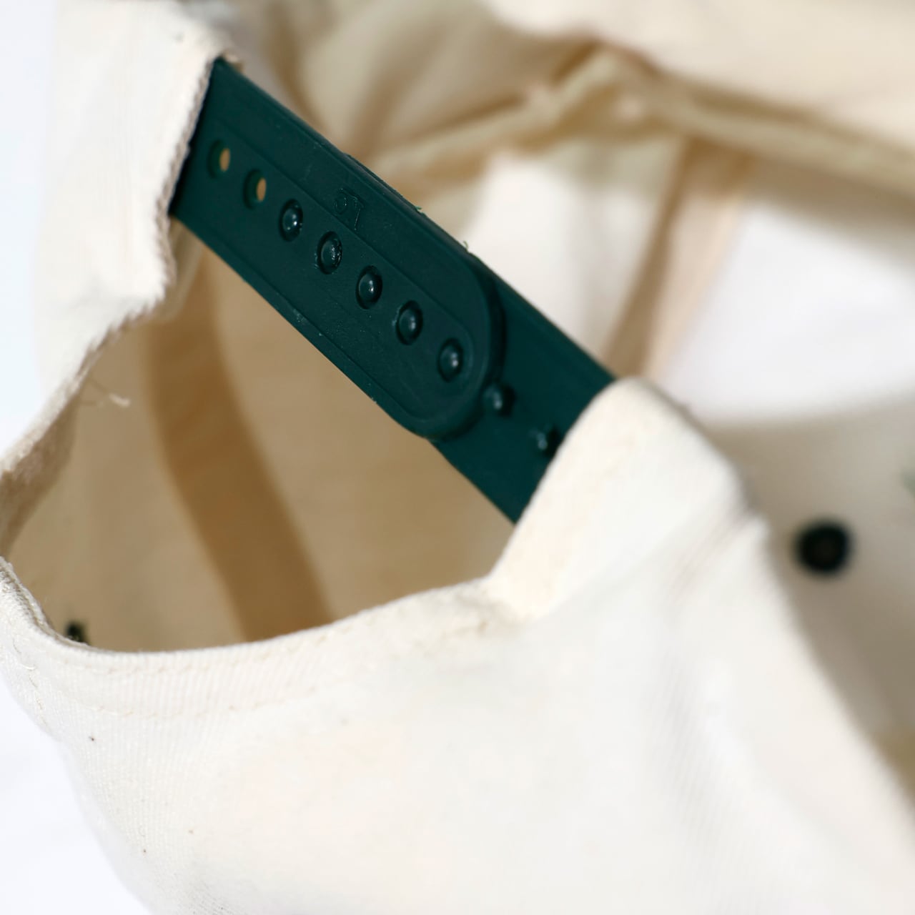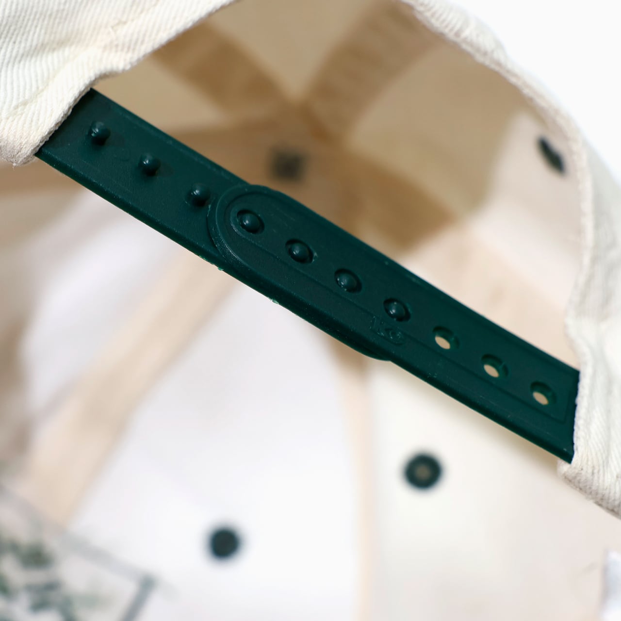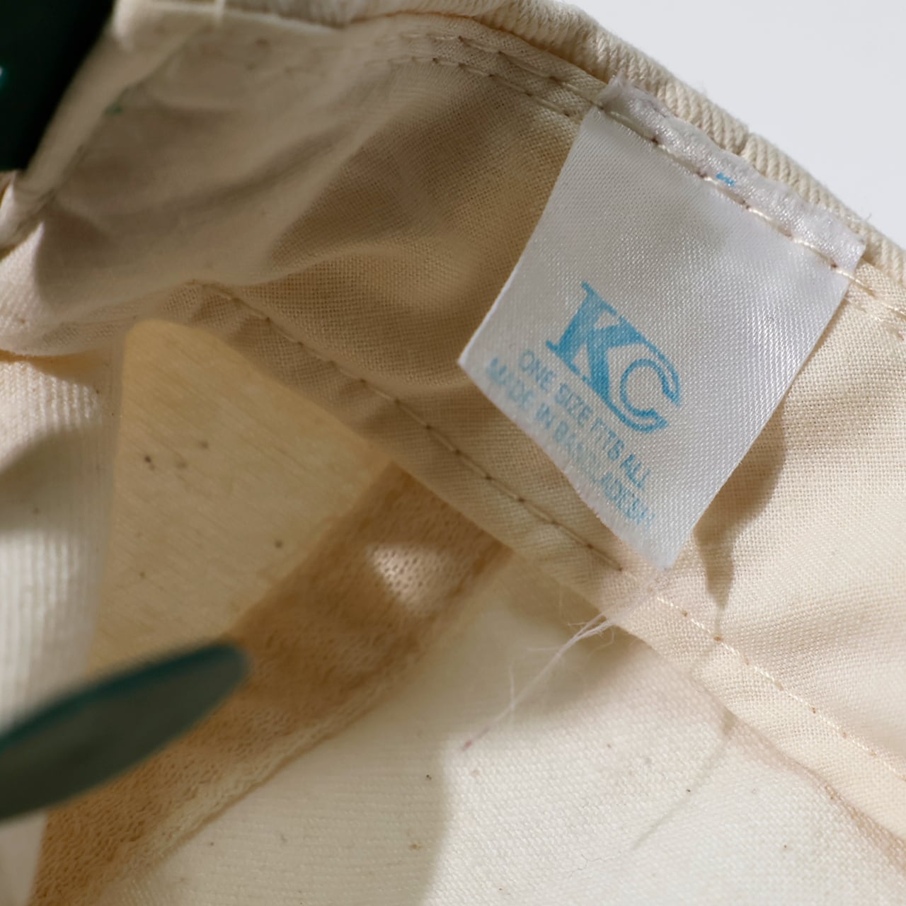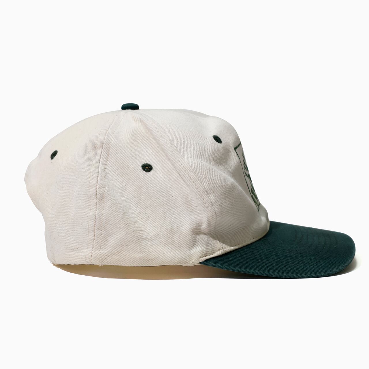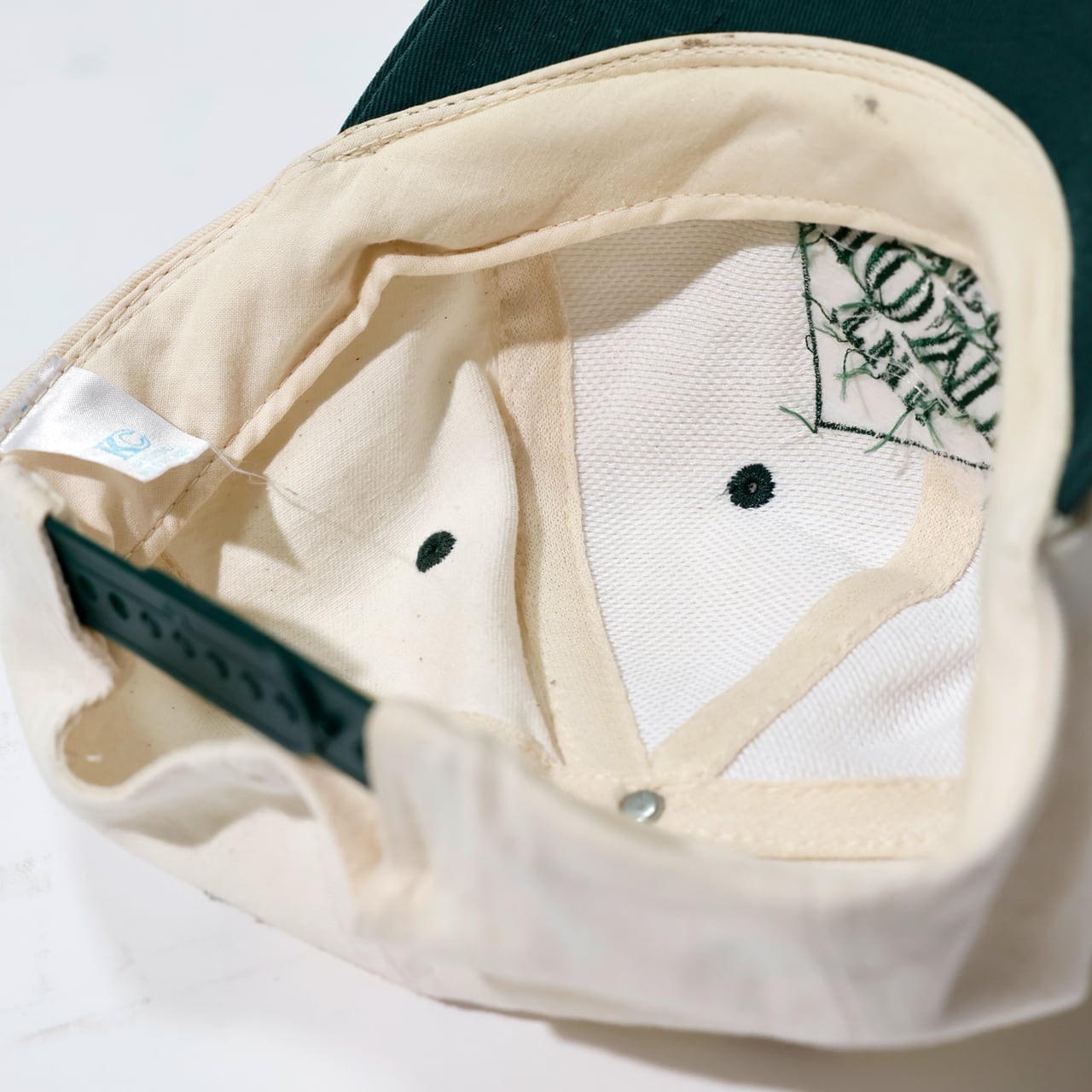 アメリカのホームセンター「THE HOME DEPOT」のキャップ。フロントに「THE HOME DEPOT」のボックスロゴが刺繍されています。よくあるショップカラーのオレンジではない生成り×グリーンの使いやすいカラーリングです。