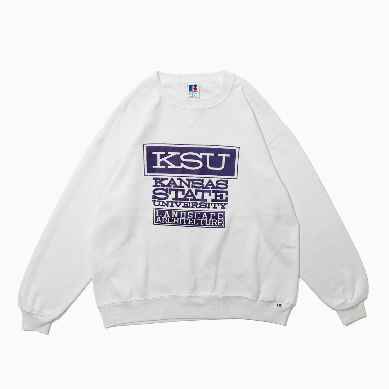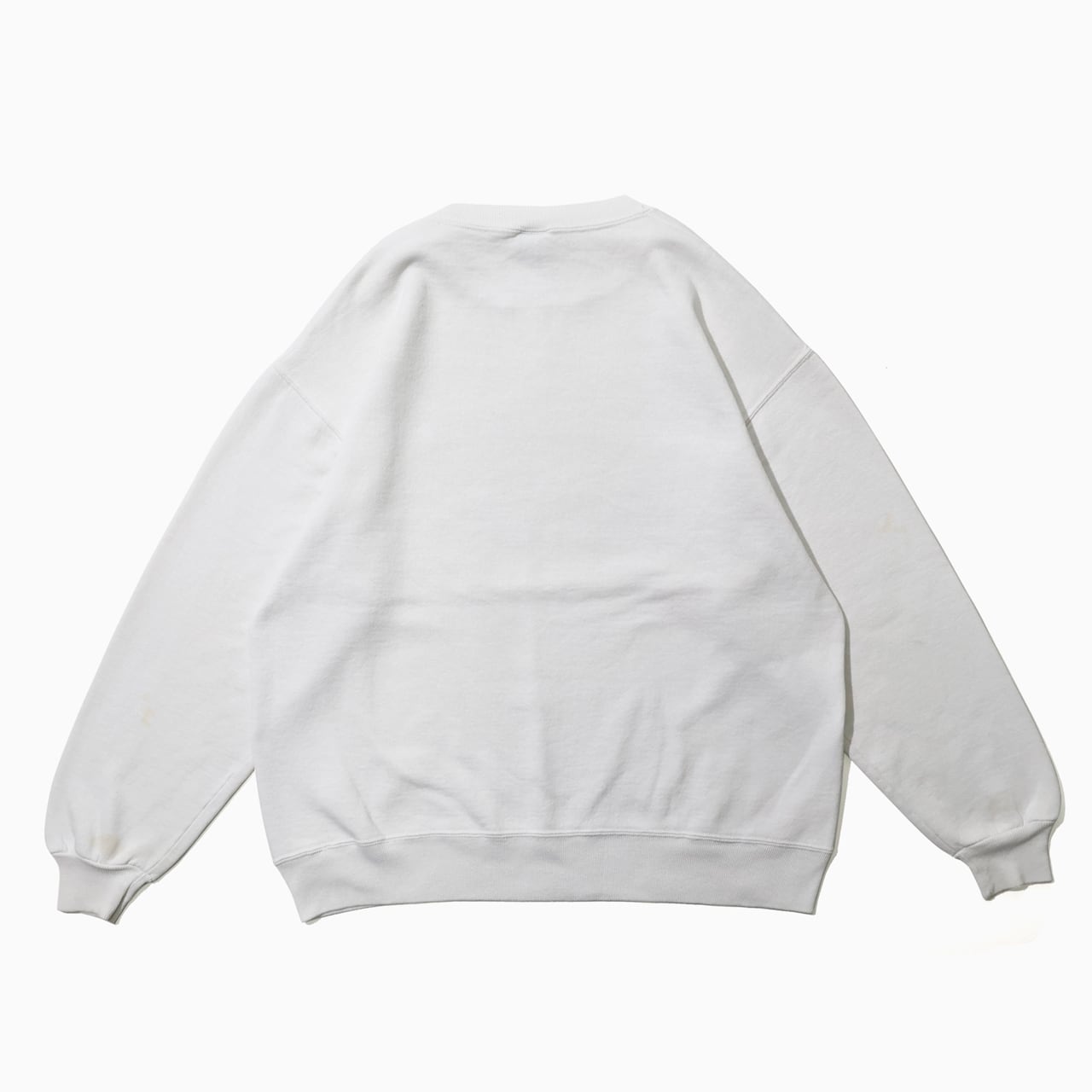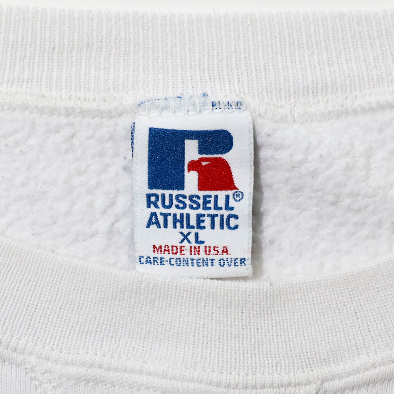 1990年代製のカレッジ物スウェット。この年代のRussellの特徴である左裾の「R」ロゴパッチや、首元の前Vガゼットが付くMade in USAのアイテム。サイズも大きめで配色も格好良い、スタイリングに合わせやすいスウェットです。