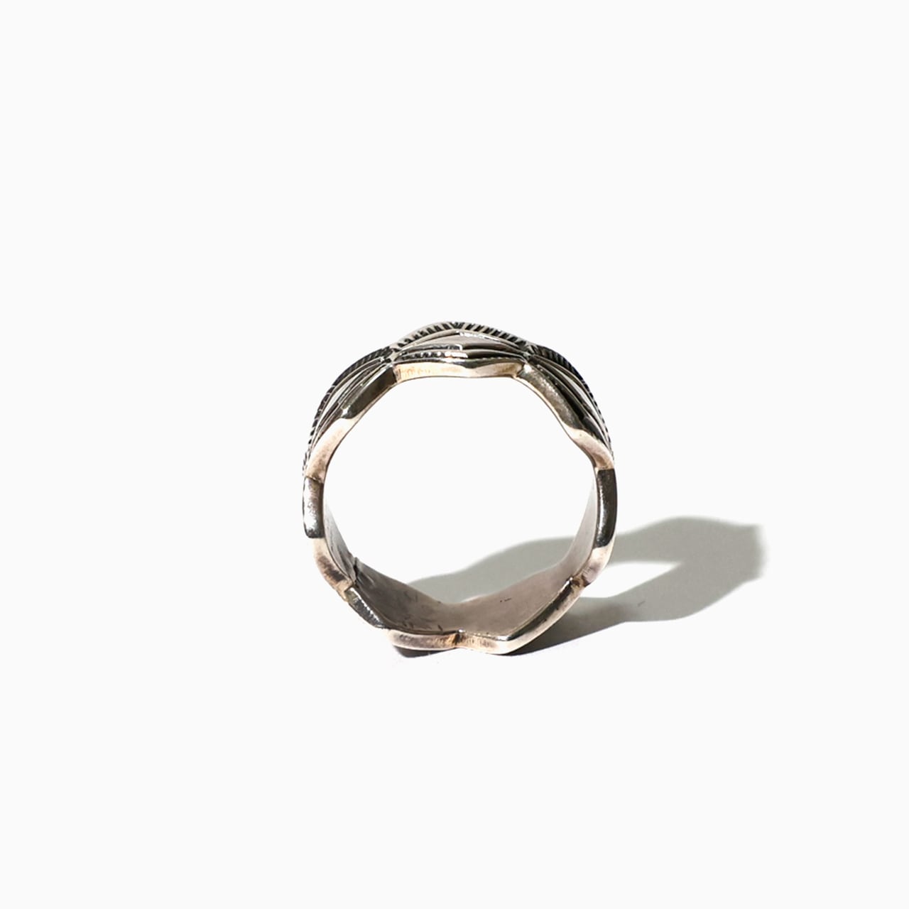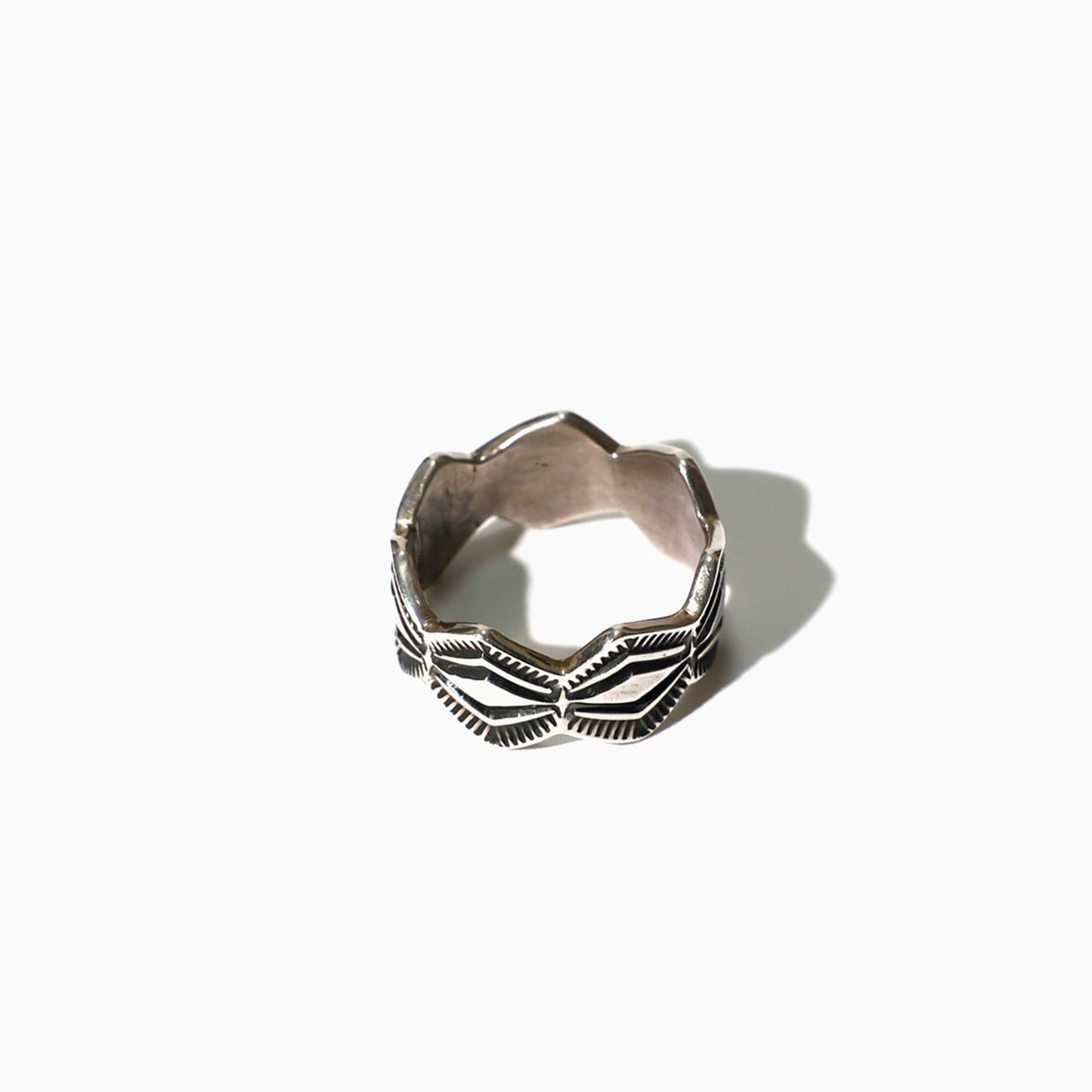 ナバホ族のスタンプワークが施され、重量感もあり無骨な雰囲気が魅力のシルバーリングです。