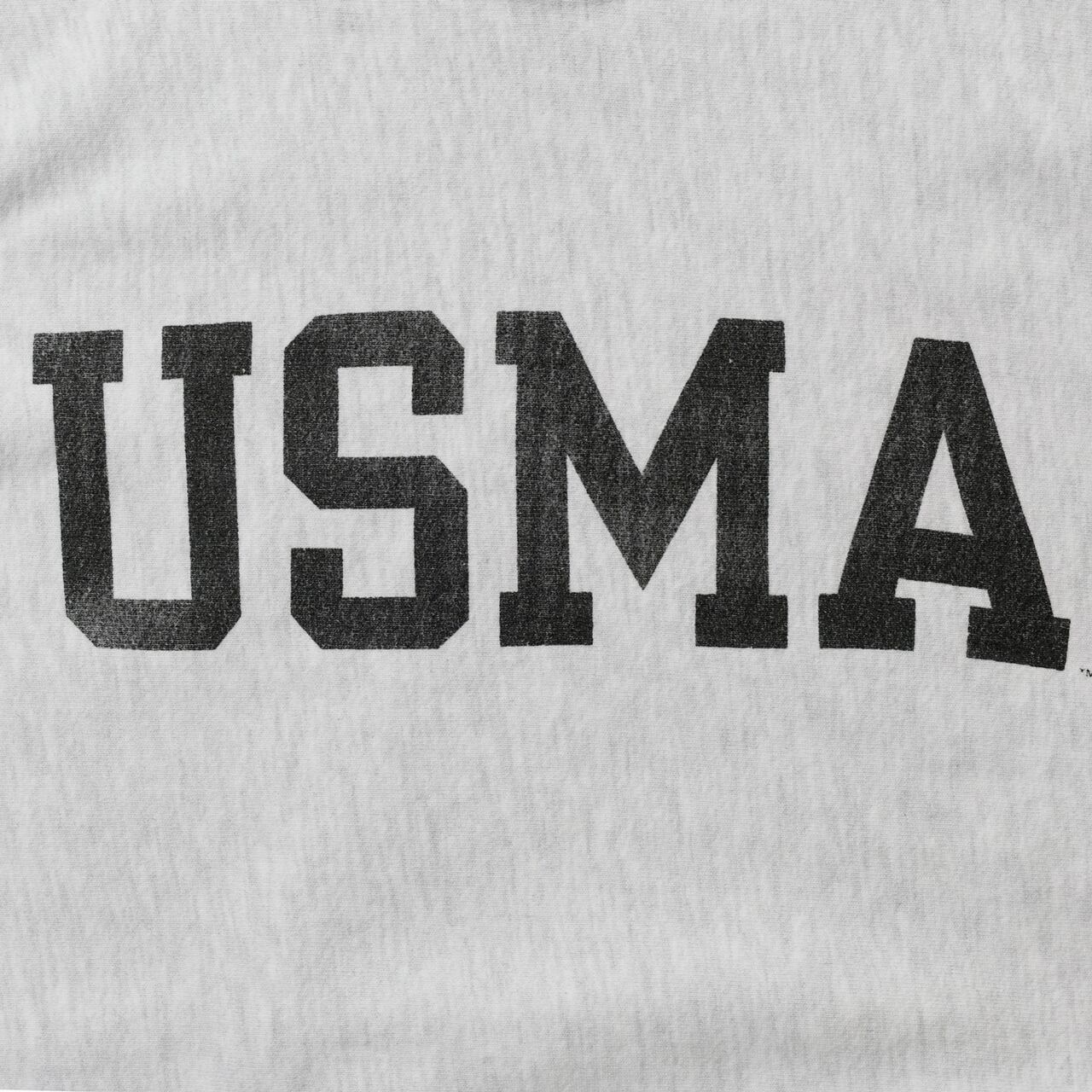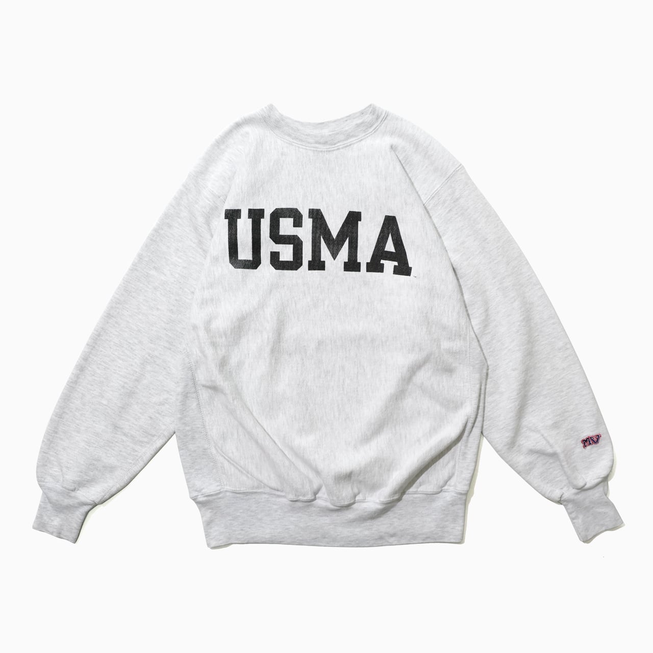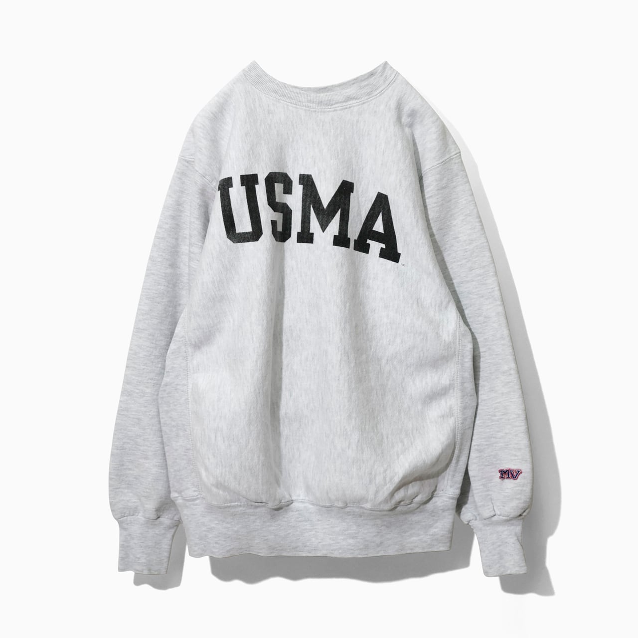1990年代MV SPORTのRWタイプスウェット。ファンも多いミリタリーモチーフ「USMA」。ブラックのプリントがどんなスタイリングにもマッチします。