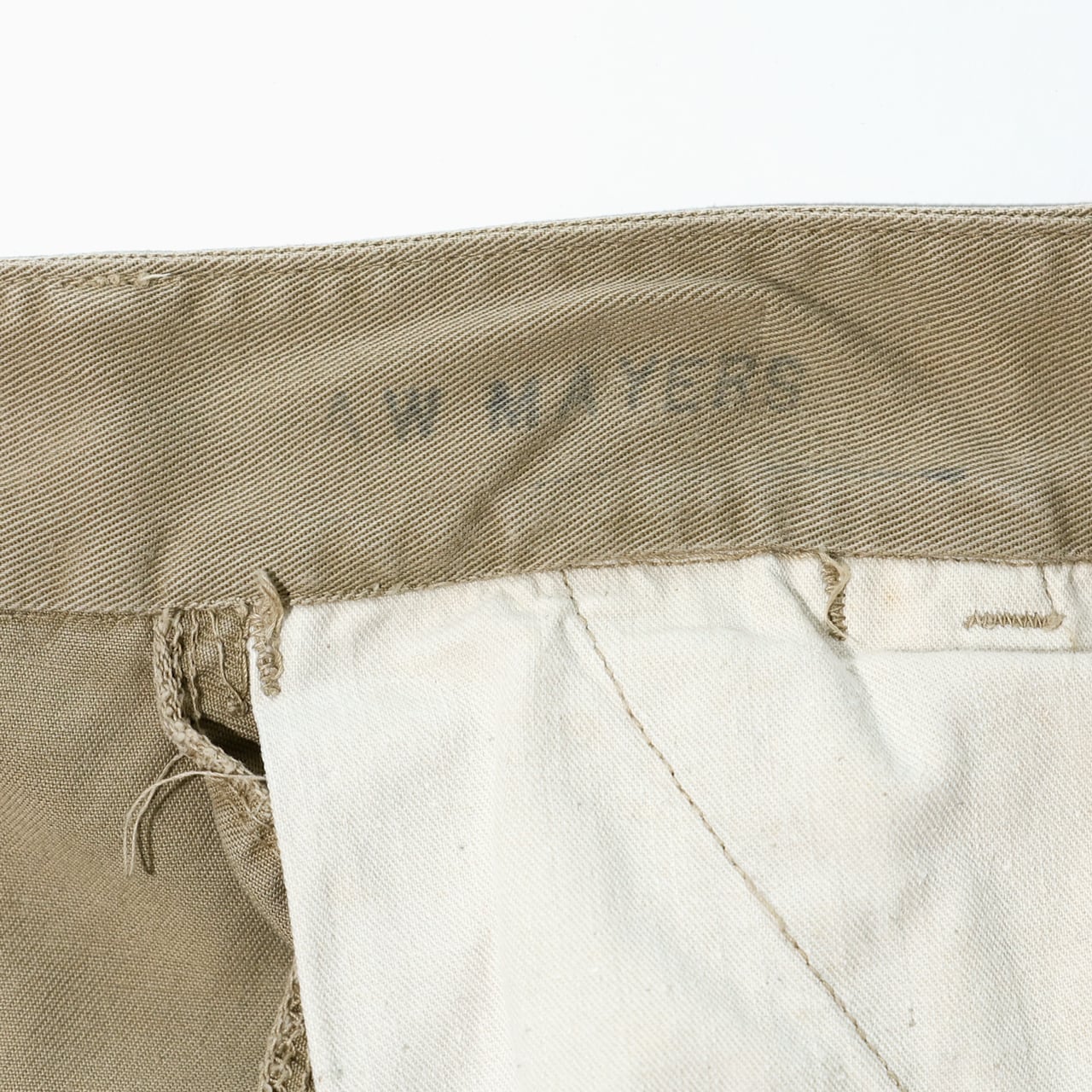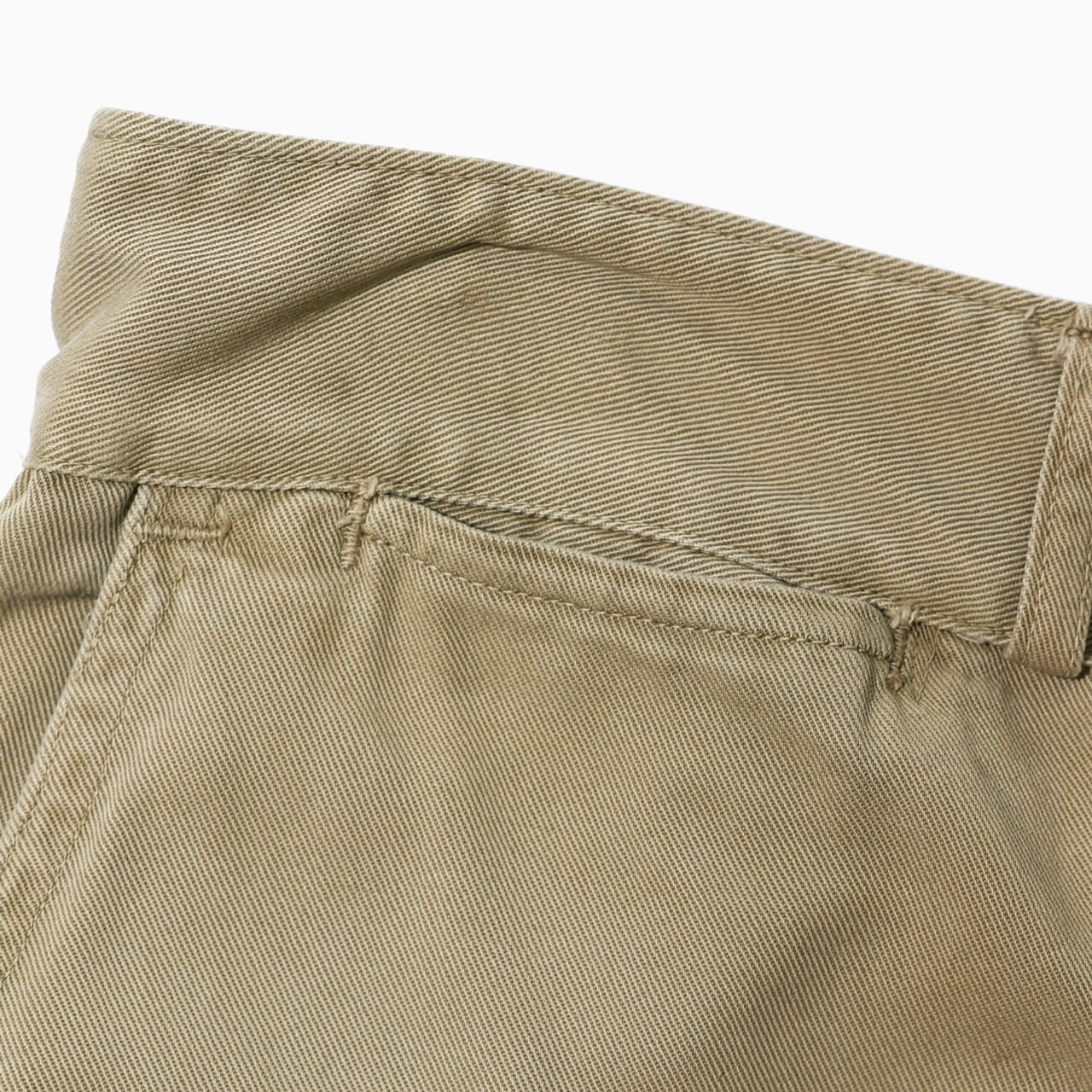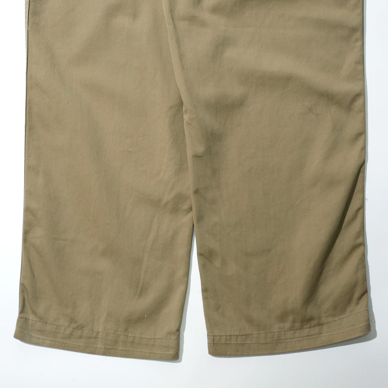 バックのフラップポケット。フロントのボタンフライ。ループは細タイプ。サイドにダブルステッチ(二本針縫製)。レングスは補正跡あり。ズトンとしたシルエットがいかにも軍チノらしい一本です。